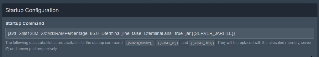 We can modify the server launch command parameters in the Startup Configuration. For Minecraft, the server is allocated 128MB of RAM by default. That seems a little low to me, so I'll change the startup command to allow for a little more RAM, say 1GB.