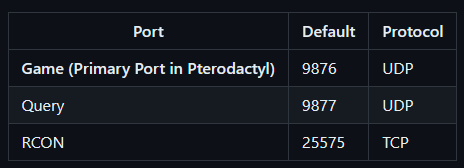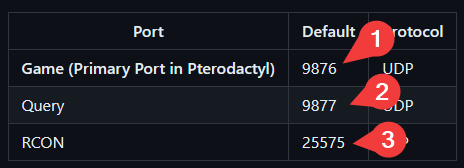 9876for the Game port and9877for the Query port. And then25575for the RCON port. But these ports can be changed into whatever you'd like.