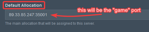 It is typically divided into "Game" and "Query" ports. When you create a new server, you allocate the "Game" port in the "Default Allocation" field. However, when configuring the server, you will usually have to manually change the Query port. If that sounds confusing right now, I'll explain when we're ready to create the server.